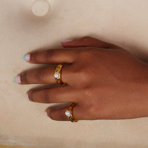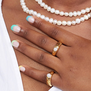 Our Tilly pearl ring has a delicate and unique feel all on its own. This pretty and petite ring is perfect for everyday wear. With a unique shape the Tilly pearl ring is simply stunning, classic, and timeless.